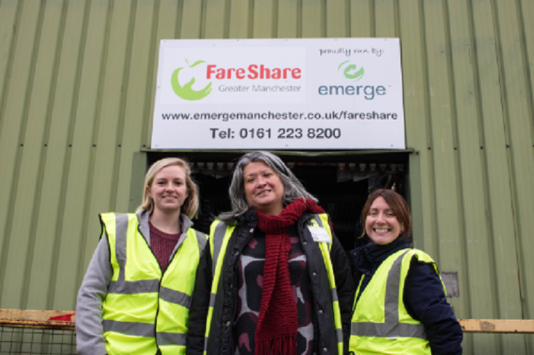 Pictured from left: Emily Wildbore, from 2SFG, Miranda Kaunang, FareShare Greater Manchester manager and Hazel Beveridge, from 2SFG.
