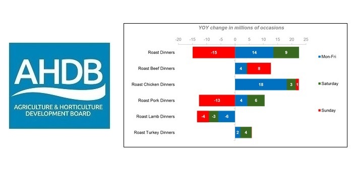 A 2% growth in the consumption of mid-week roast dinners in the past year was worth the equivalent of eight million extra meals, with chicken being the main beneficiary, according to the Agricultural and Horticultural Development Board (AHDB).
