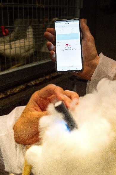 The technique involves measuring the fat pad in a random sample of 50 to 100 hens. Results are logged directly via Bluetooth to a mobile device. Monitoring is best carried out routinely and a log kept of the flock’s body condition over time. However, ad hoc monitoring can be carried out where appropriate.